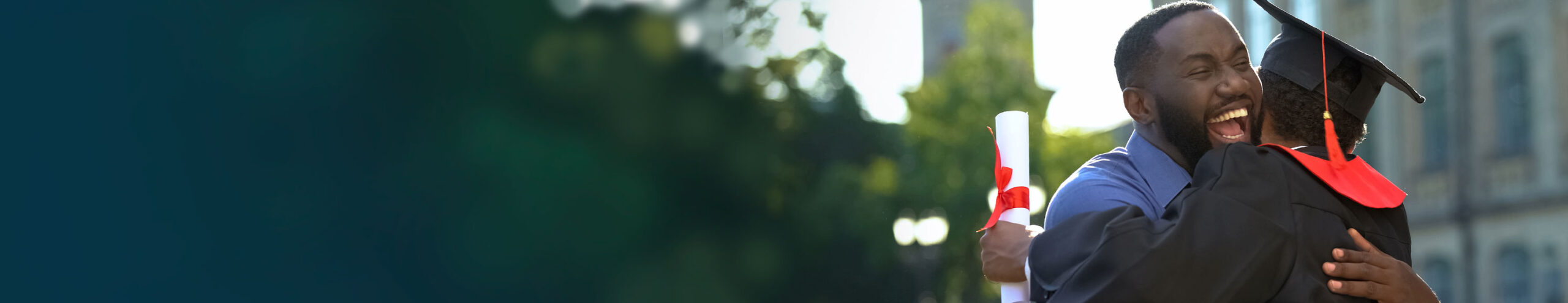 Excited father embraces his son who is wearing a graduation cap and gown and holding a diploma