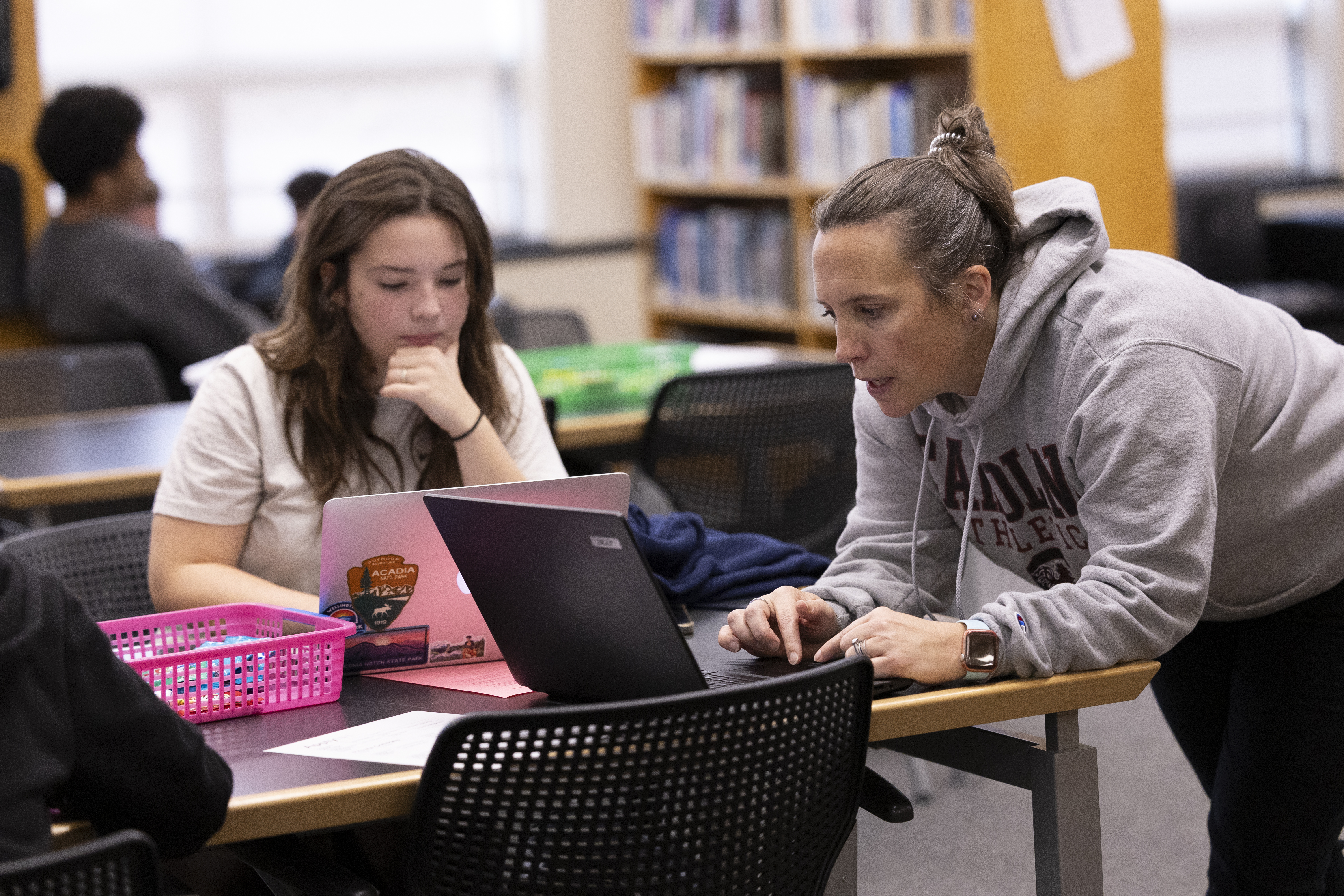 Caption information: A student works on college applications with school counselor Shanyn Grenier at Merrimack Valley High School’s ApplyNH event in 2024.
