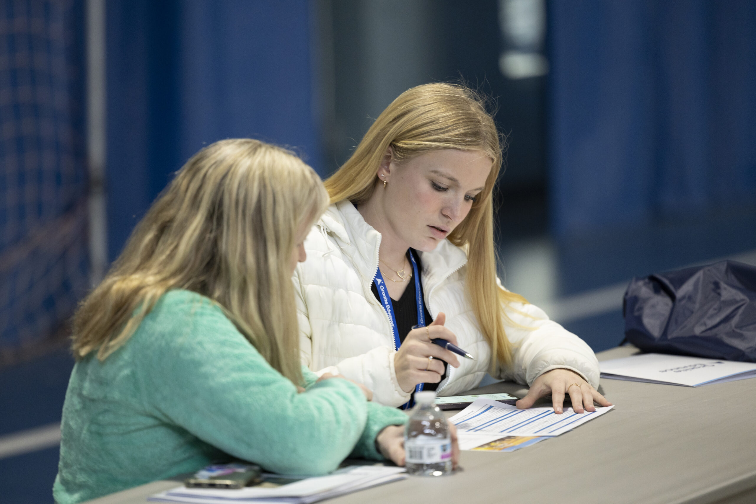 Caption information: Attendees at Granite Edvance’s 2024 Destination College event at Saint Anselm College review materials. Photo by Corey Garland.