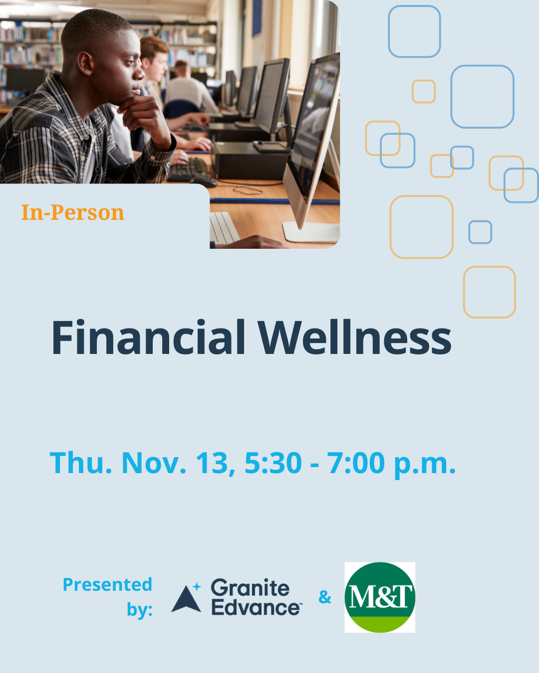 Looking for help with financial wellness? We’re excited to partner with M&T Bank to bring you this free in-person event.