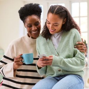 Mother and daughter huddle together in the kitchen to look at something on the daughter’s phone. Both are smiling, and one of the mother’s arms is wrapped around her daughter, the other hand holding a mug.